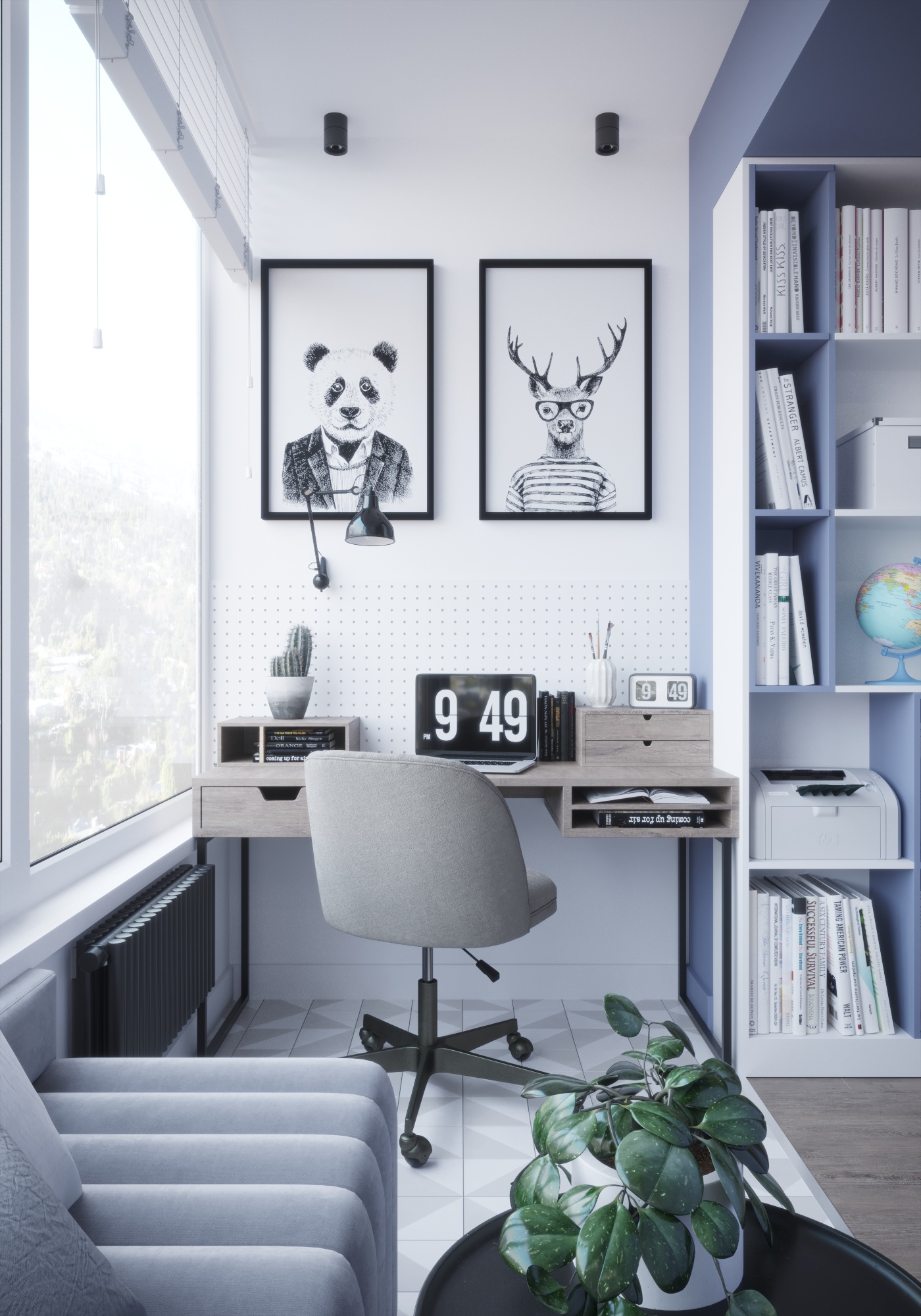 В детской использовали мягкие панели в зоне кровати, выполнили зонирование потолком, лоджию утеплили и сделали там рабочее место и зону отдыха для сына.