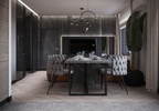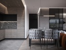 Заходя в квартиру мы попадаем в коридор с вместительным шкафом, зеркалом и консолью, из коридора видим столовую зону, справа от нее кухня в сочетании шпона дерева и черного цвета FENIX на верхних фасадах, это идеальный вариант, если вы хотите черное покрытие, оно будет матовым и не оставляет пальчиков, слева от столовай зоны - гостиная и спальня, это воспринимается единым пространством, спальня отдельно выгорожена раздвижными перегородками Rimadesio, детская комната изолирована, попадаем мы в нее из гостиной, слева от телевизора дверь скрытого монтажа прячется под каменным шпоном, чтобы не дробить стену и сделать ее большим единым полотном
