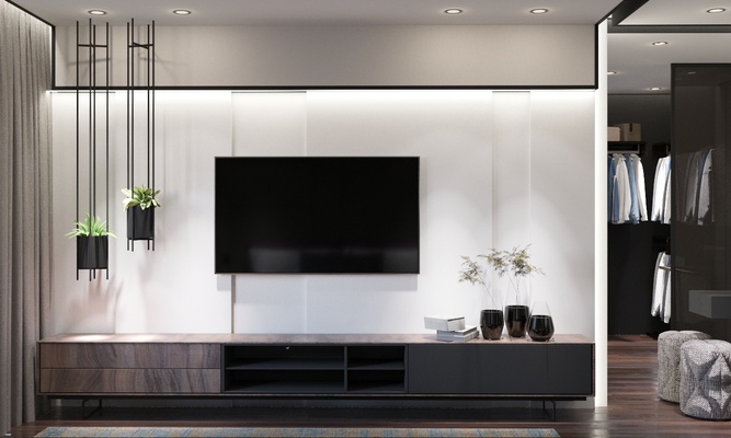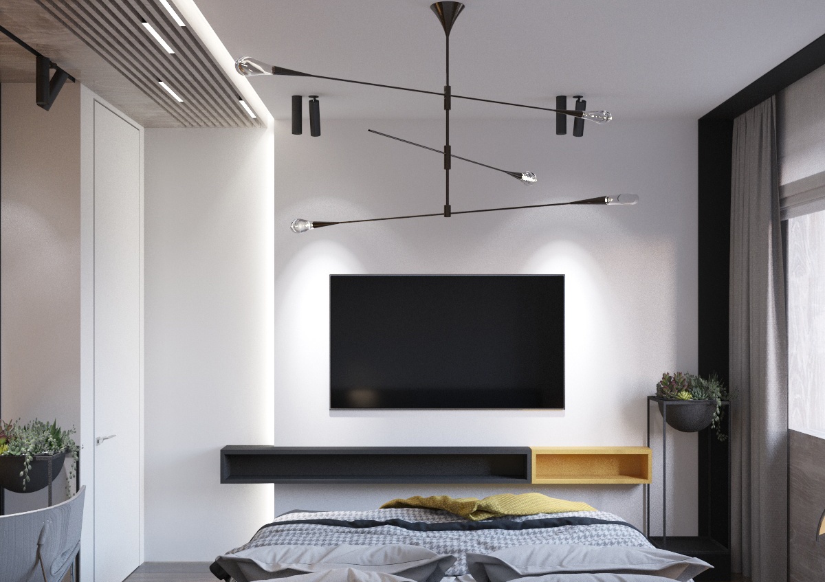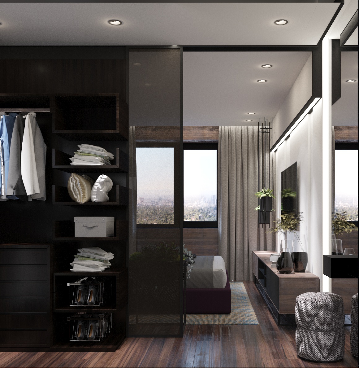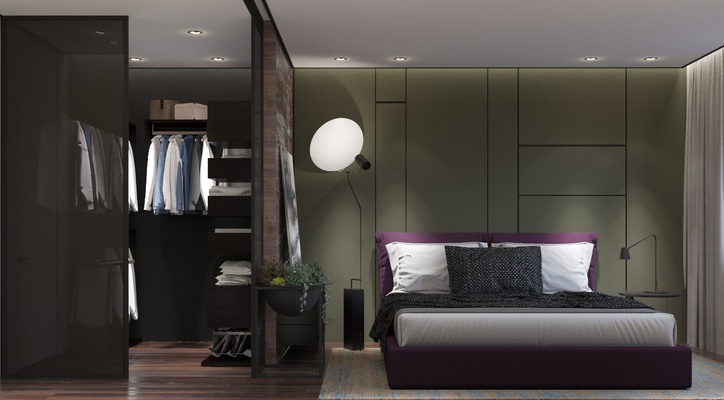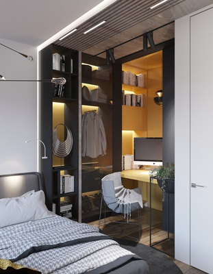 От входа налево гостевой санузел с телевизором, особая изюминка по функционалу. Справа от входа коридор в спальни и ванную комнату. В основной спальне расоложили гардероб за раздвижной перегородкой из темного стекла. В гостевой спальне есть рабочий стол и небольшой шкаф для одежды, реализовано отдельной зоной.