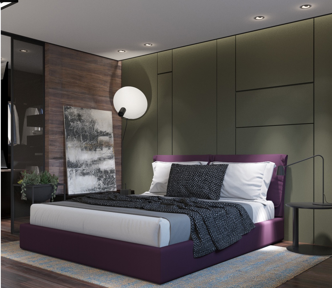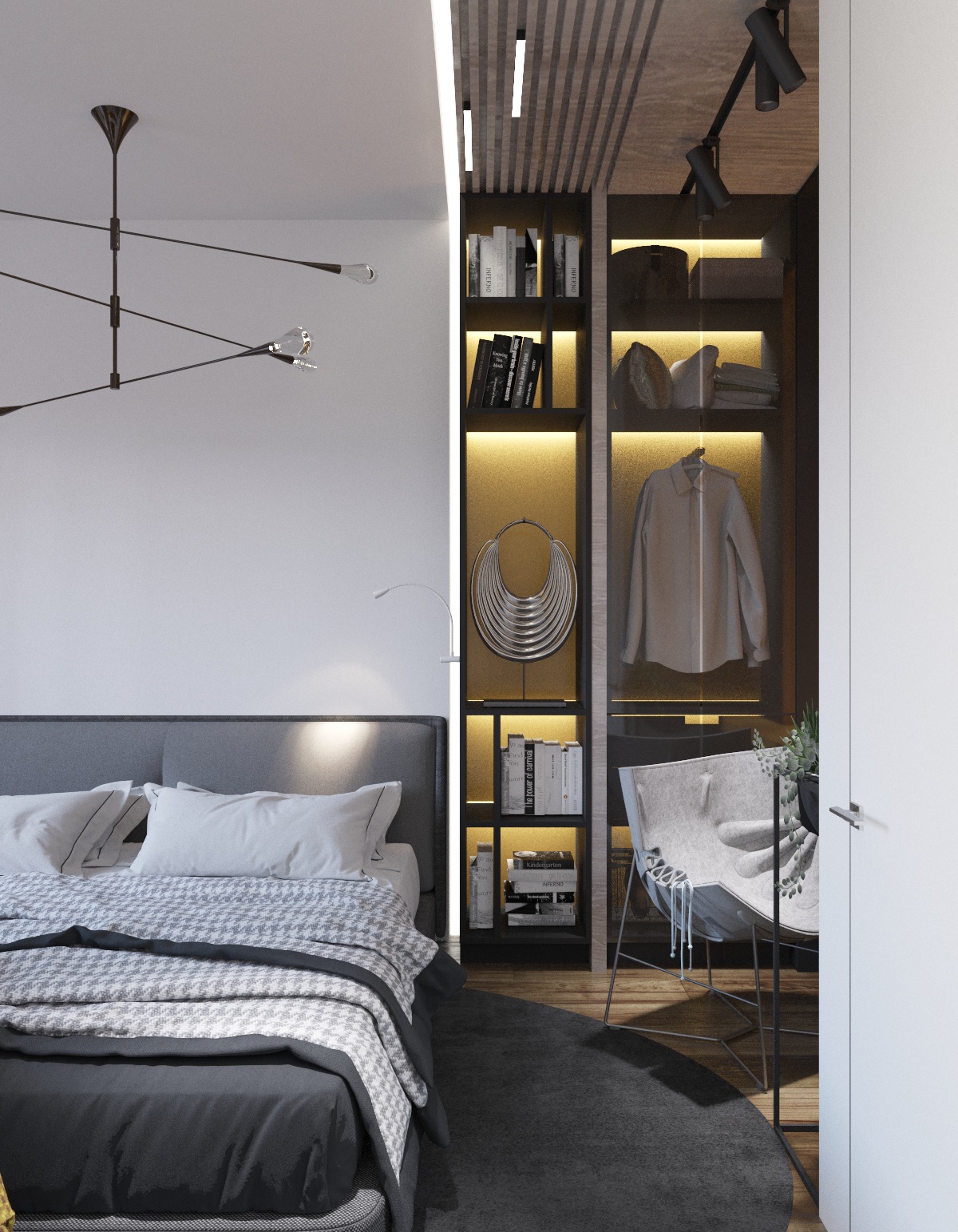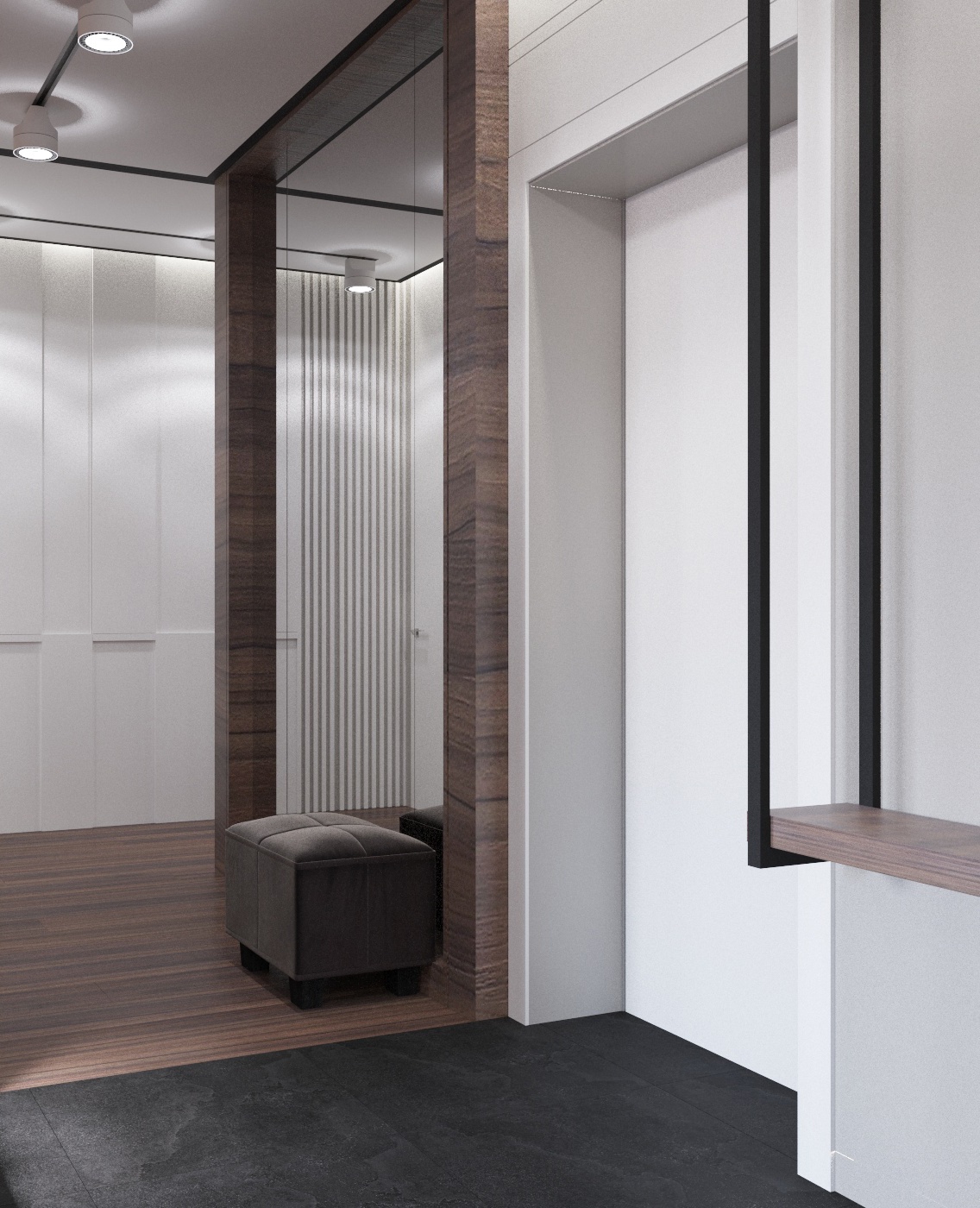 От входа налево гостевой санузел с телевизором, особая изюминка по функционалу. Справа от входа коридор в спальни и ванную комнату. В основной спальне расоложили гардероб за раздвижной перегородкой из темного стекла. В гостевой спальне есть рабочий стол и небольшой шкаф для одежды, реализовано отдельной зоной.