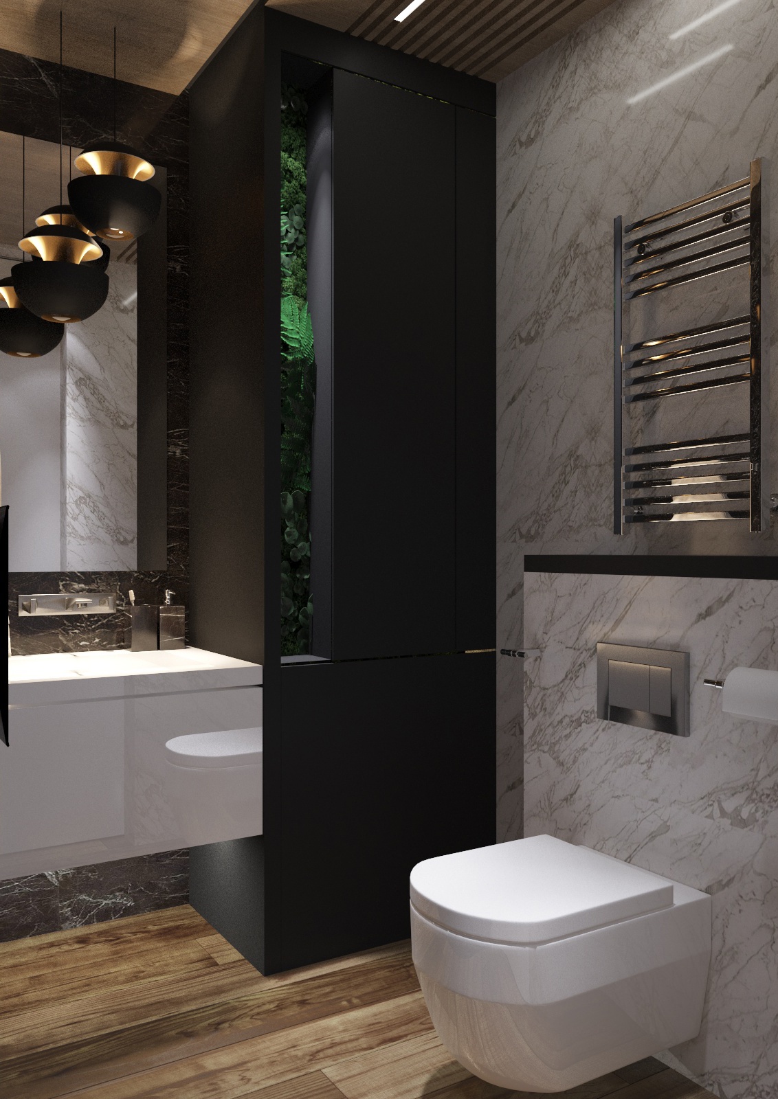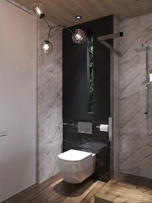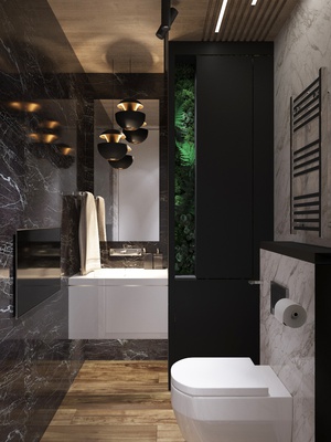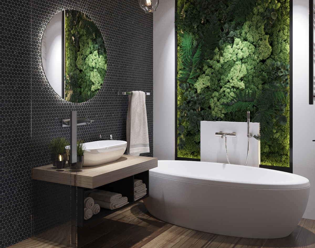 В ванной комнате использовали панно из стабилизированного мха и искусственных растений премиум класса, оно выглядит как живое и создает свою неповторимую атмосферу.