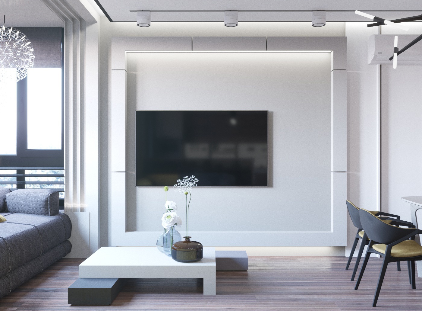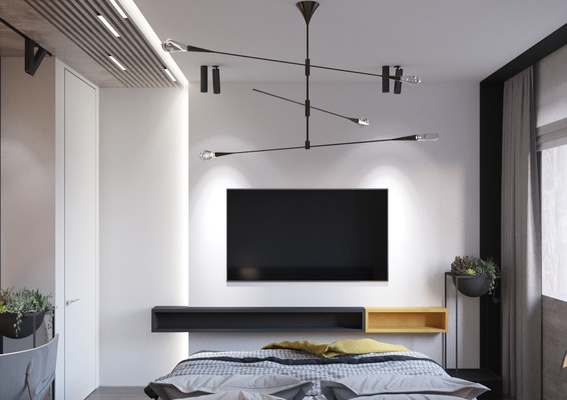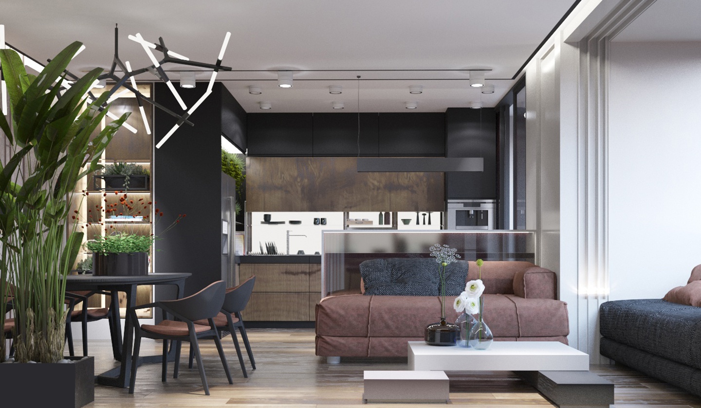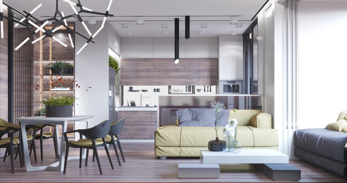 Проект квартиры для семейной пары с уже взрослыми детьми. Задачей было сделать современный интерьер с просторной кухней-гостиной и выделить 2 спальни, основную и гостевую.