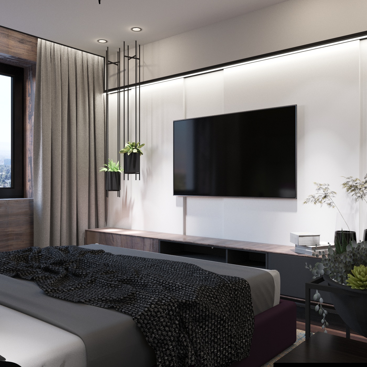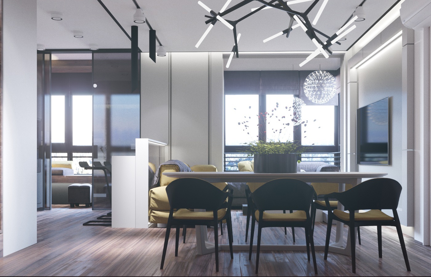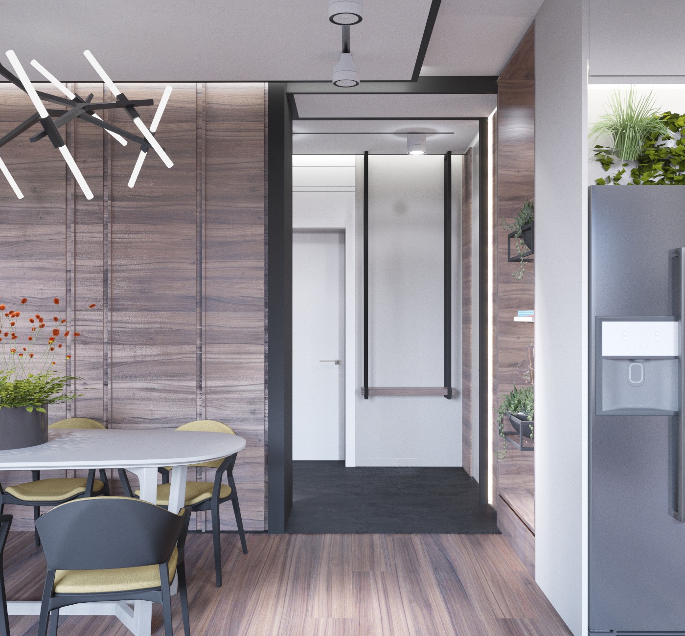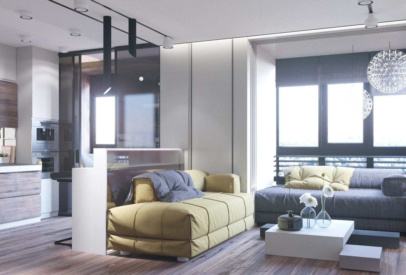Проект квартиры для семейной пары с уже взрослыми детьми. Задачей было сделать современный интерьер с просторной кухней-гостиной и выделить 2 спальни, основную и гостевую.