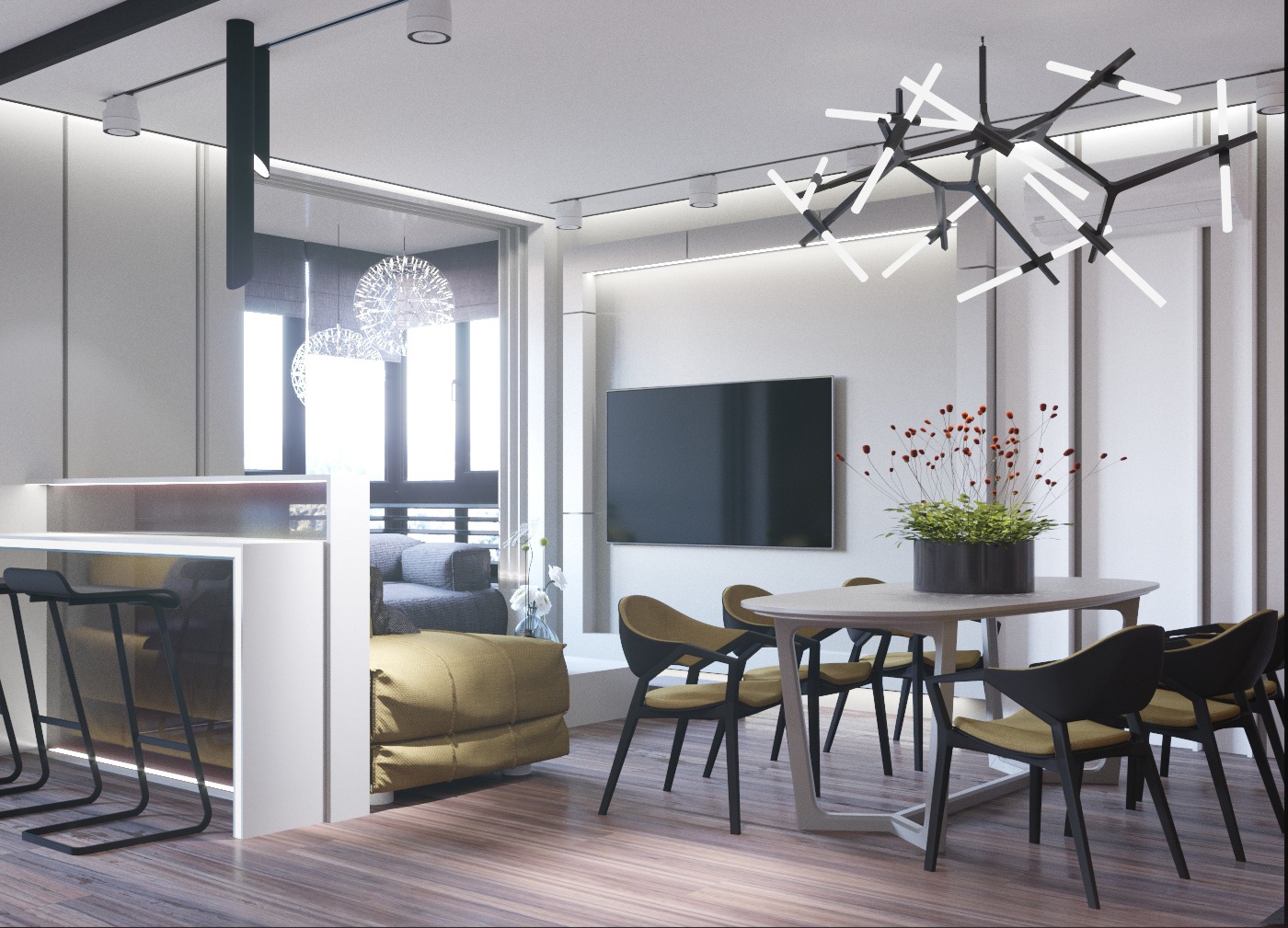 Заходя в квартиру мы видим прихожую и часть кухни, выстраивали композицию так, чтобы это вызлядело как картина в раме, продумывали все элементы в этом квадрате в сочетании, от барной стойки до подвесного всетильника. Если пройдем прямо, то сразу попадаем в светлую гостиную спава, там же зона столовая, налево коза кухни, Кухня здесь нестандартная, за аналог взята модель от Valcucine, интересно то, что когда ей не пользуюдся она полностью закрыта, зона хранения расположена в фартуке, даже кран, сушка для посуды, специи и процее необходимое, все это подсвечено и выглядит как произведение искусства для истинных центителей процесса приготовления пищи, также вытяжка тут реализована скрытая, в столешнице, в нашем случае со сменными модулями офистки.