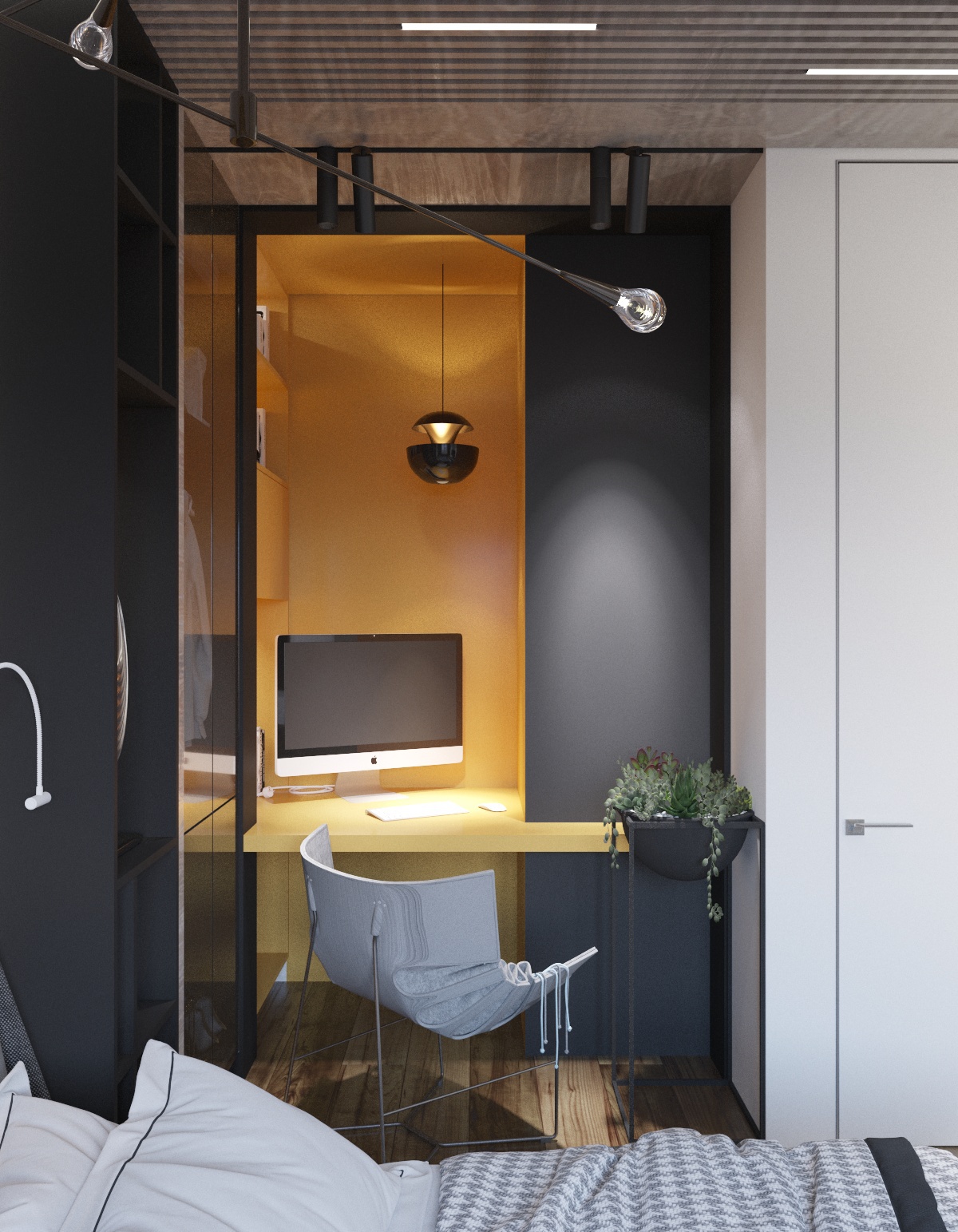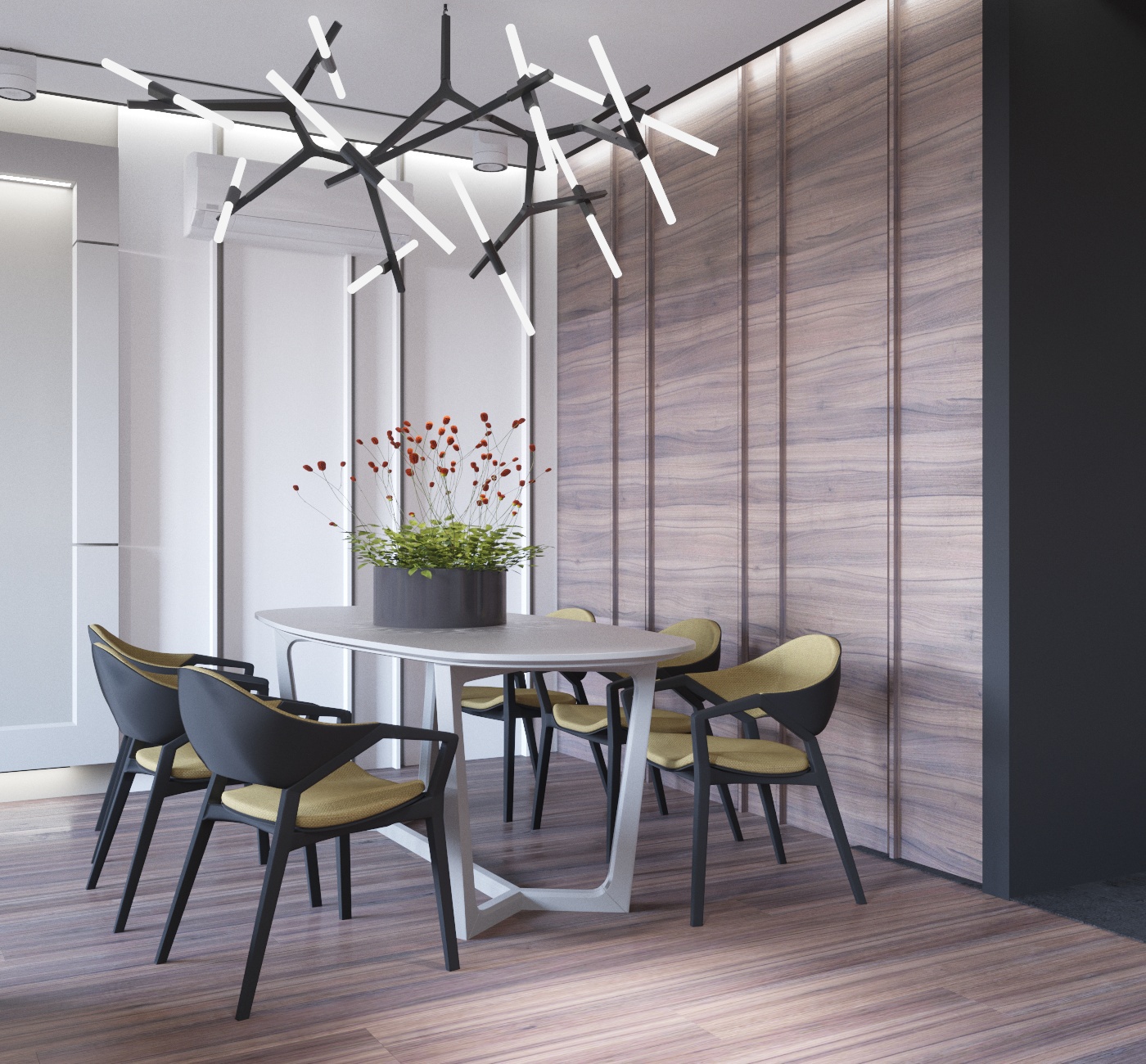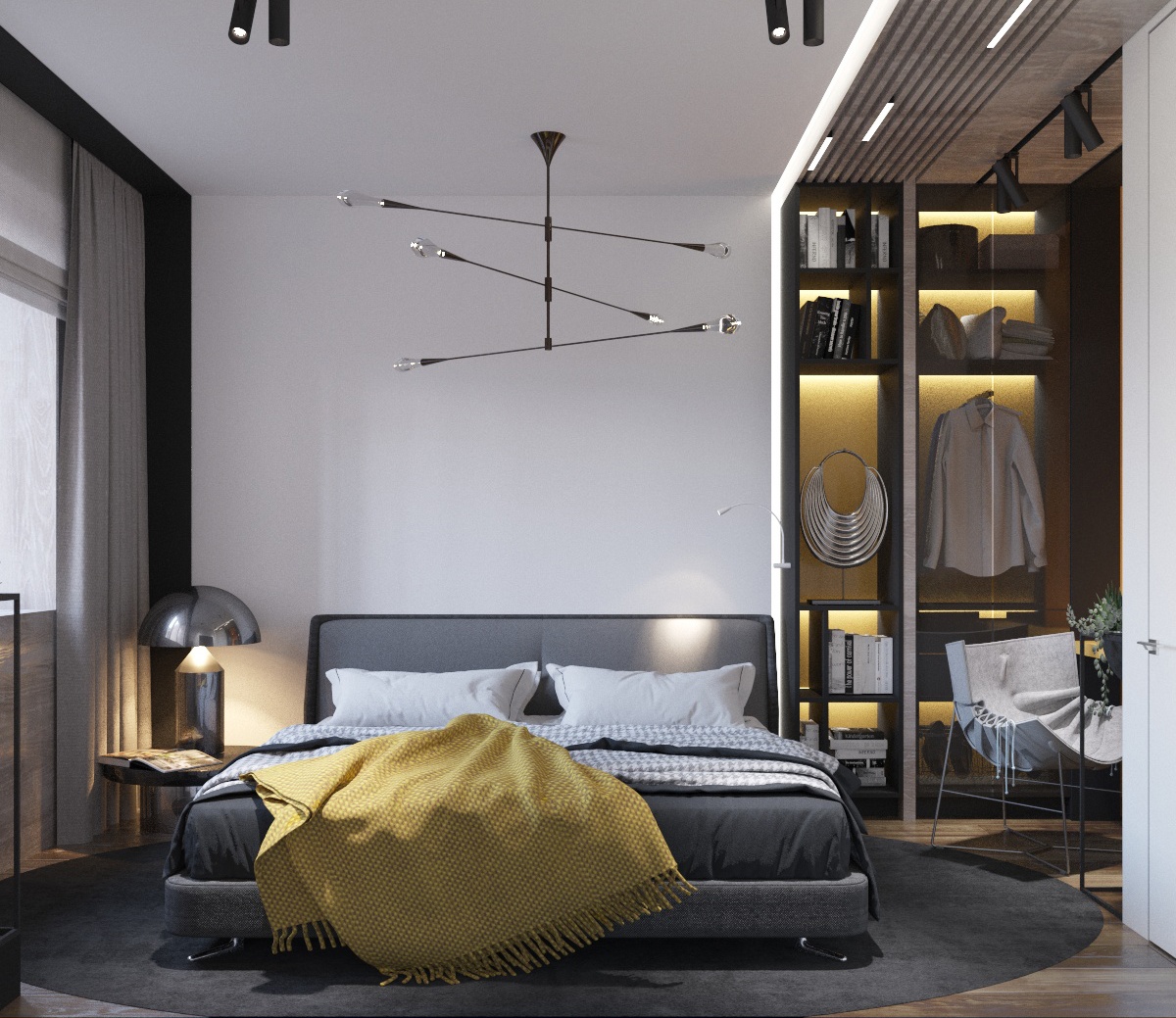 В проекте использовали темные акценты, натуральные материалы с добавлением желтого цвета и графичных элементов, основной фон светлый.