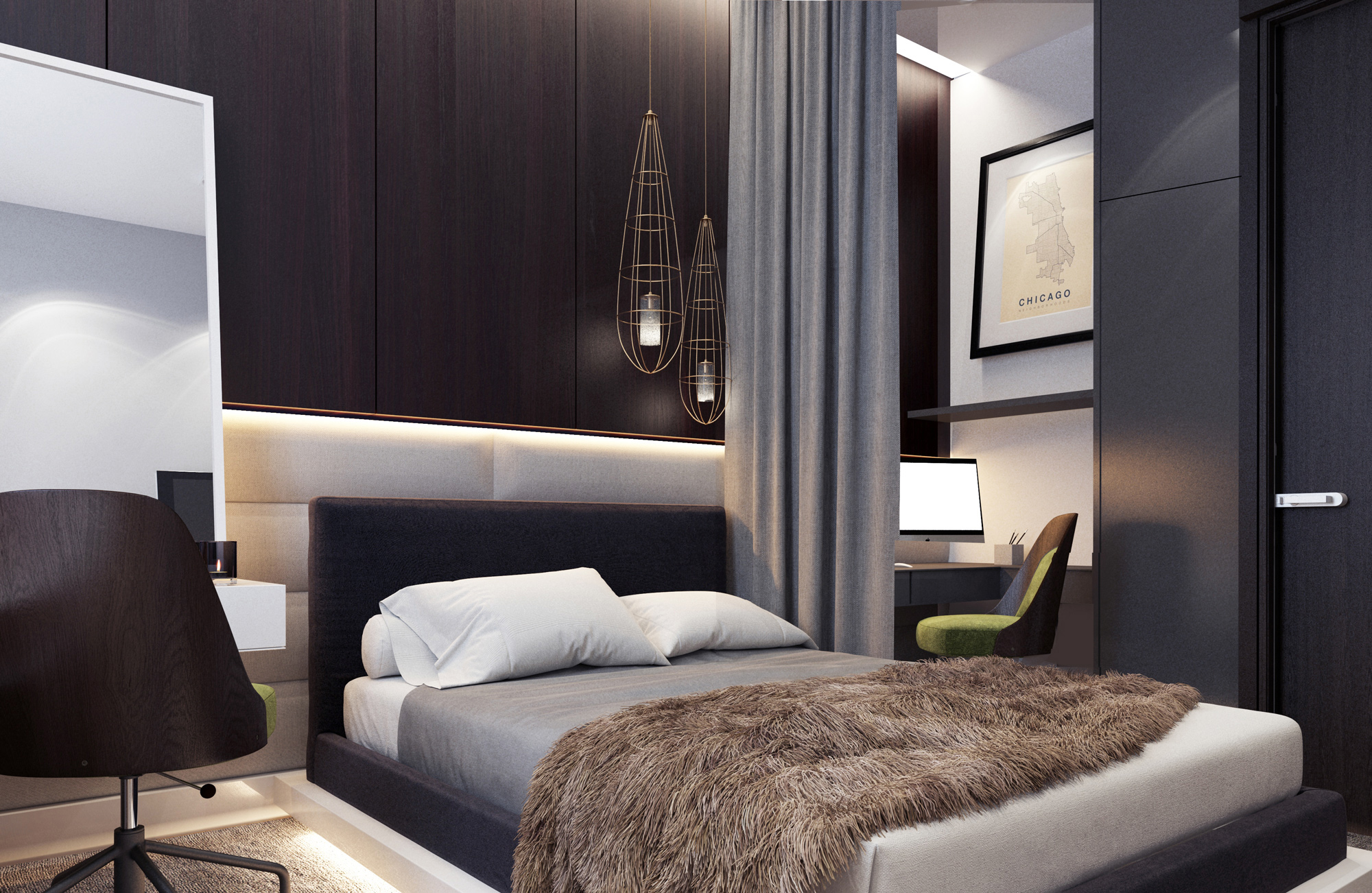 От входа налево гостевой санузел в керамограните под натуральный камень. Справа от входа коридор в спальни и ванную комнату. В основной спальне расоложили только спальное место и 2 рабочие зоны, одна для супруги, она создает кукол ручной работы, неоходимо было предусмотреть достаточно насыщенную систему хранения, для тканей, ленточек, пуговок и прочих прелестей, не забывая про максимально большой стол, место ему определили у окна. Второе рабочее место для супруга в дальней части комнаты, он работает за компьютером, программист, нужно было учесть достаточно место для 2х мониторов и главное отделить эту зону от кровати шторой, т.к. супруг часто работает ночью и не хочет мешать спать, поэтому мы предусмотрели скрытый карниз и штору, которая прячется в дневное время в нише. Шкафа под одежду здесь нет, т.к. в квартире по планировке уже была гардеробная и мы ей воспользовались по назначению.