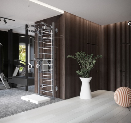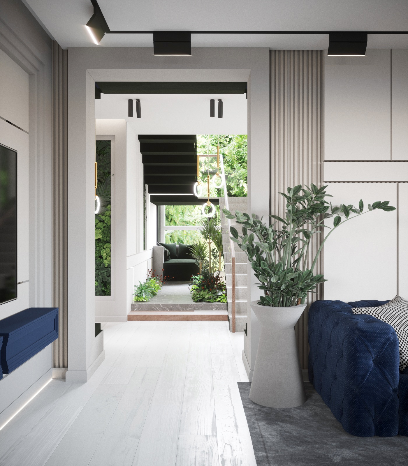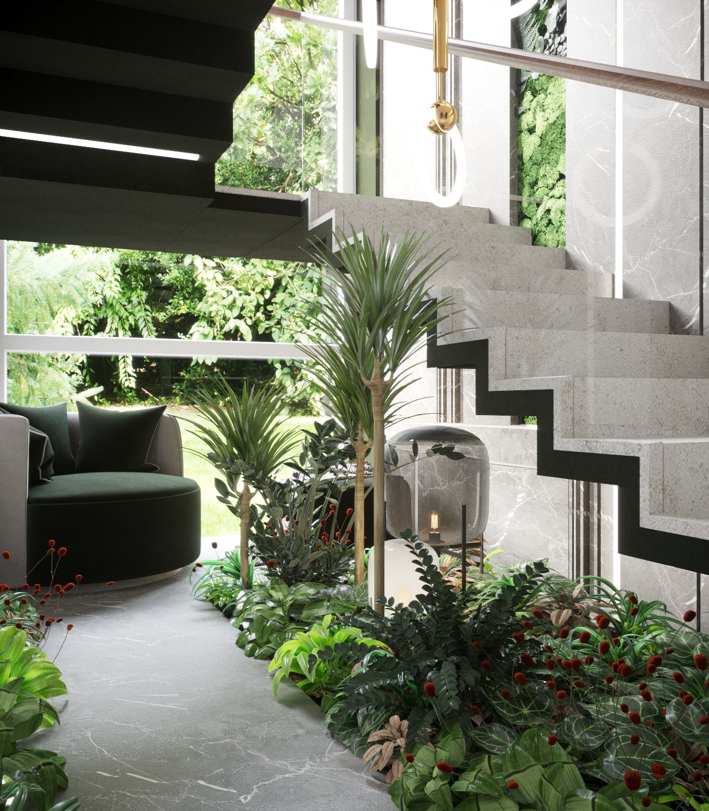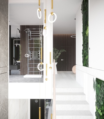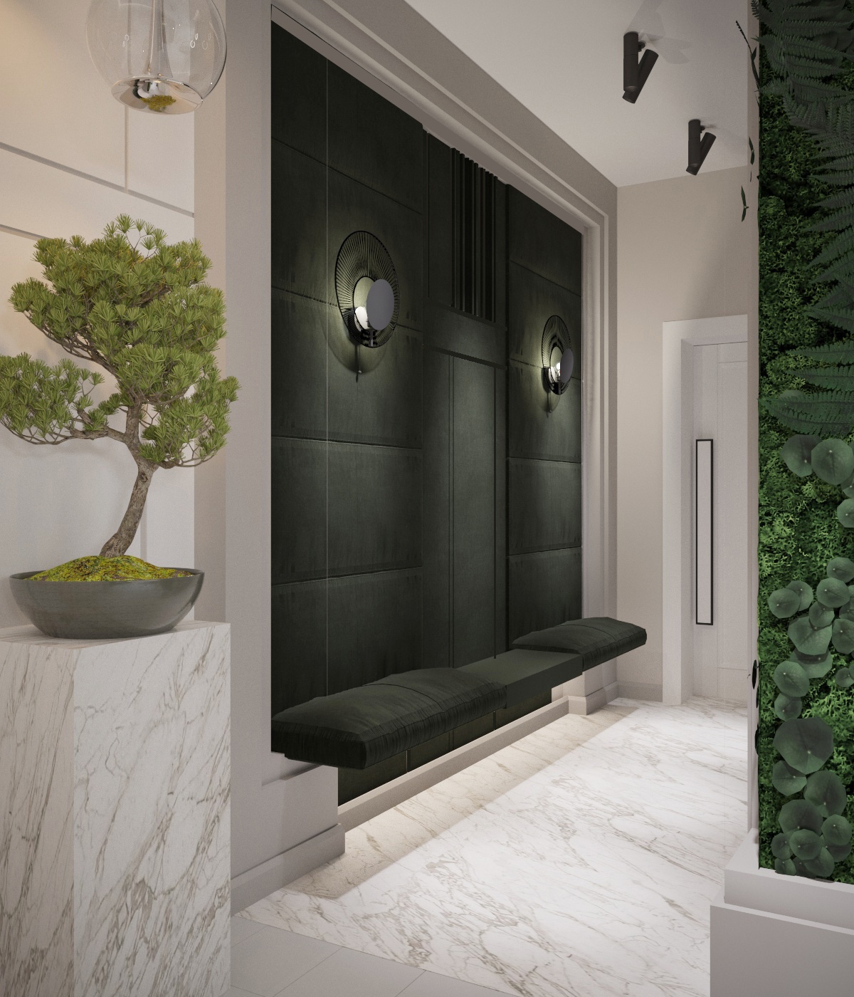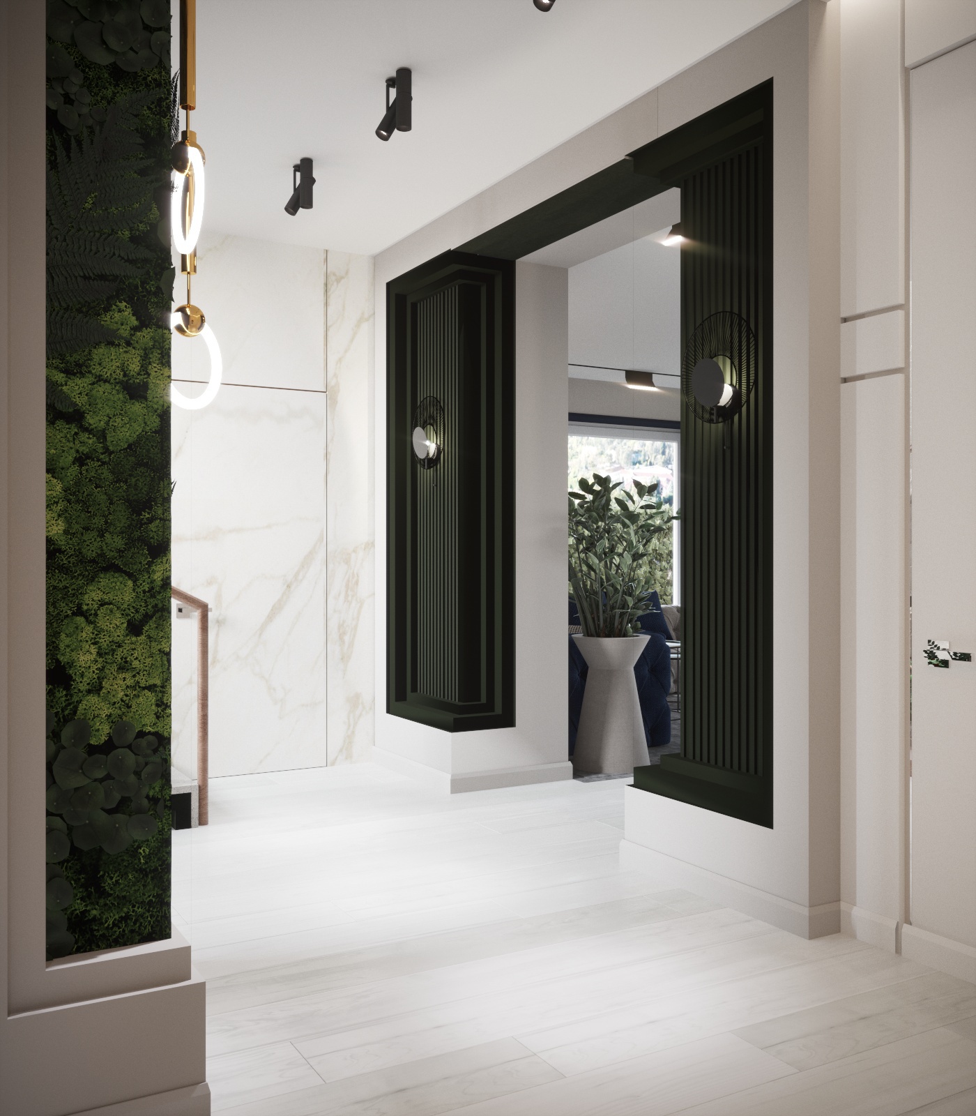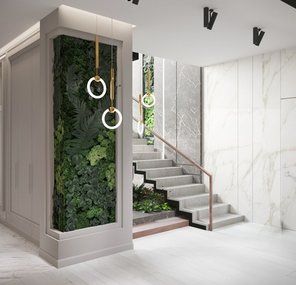 Заходя в дом мы попадаем в узкое пространство, которое мы расширили визуально большим зеркалом, это отличный прием для узких коридоров. Справа мягкая панель невероятного темно-зеленого цвета с сиденьями для того, чтобы обуться. Слева вместительный гардеробный шкаф. пройдя дальше мы попадаем в просторный холл с лестницей, утопающей в зелени, с огромным окном от пола до потолка 2го этажа. Лестница выполнена из металкаркаса с накладными бетонными ступенями и подшивной нижней частью под покраску - того же зелено цвета из коридора. Тема зелени не только под лестницей, где использовали живые растения, но и на стене в виде панно из стабилизированного мха и искусственных растений премиум класса, выглядят они как живые.