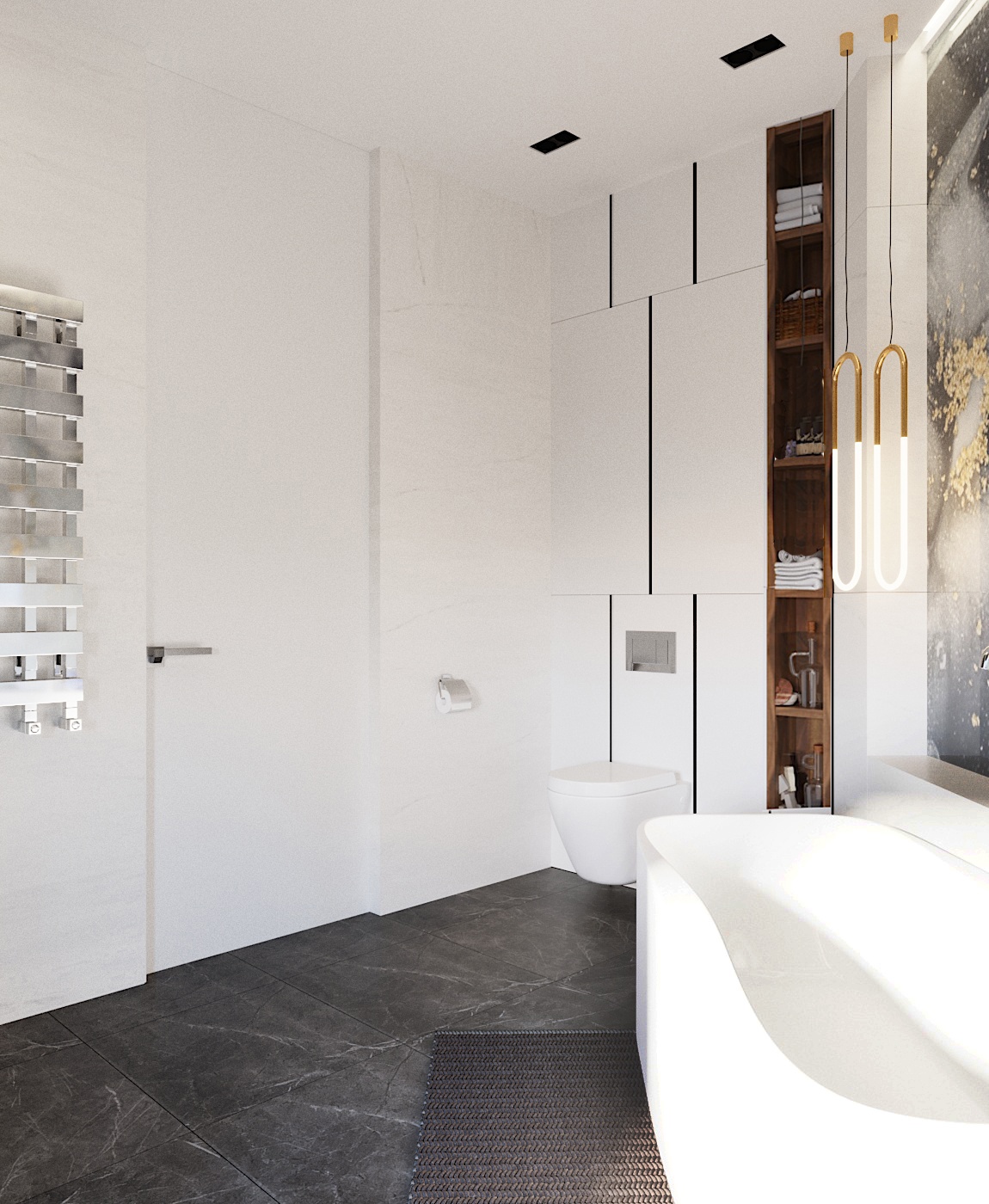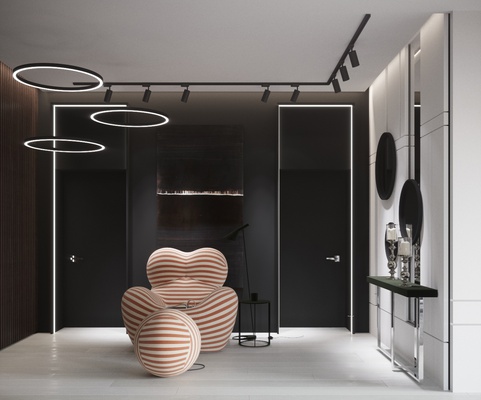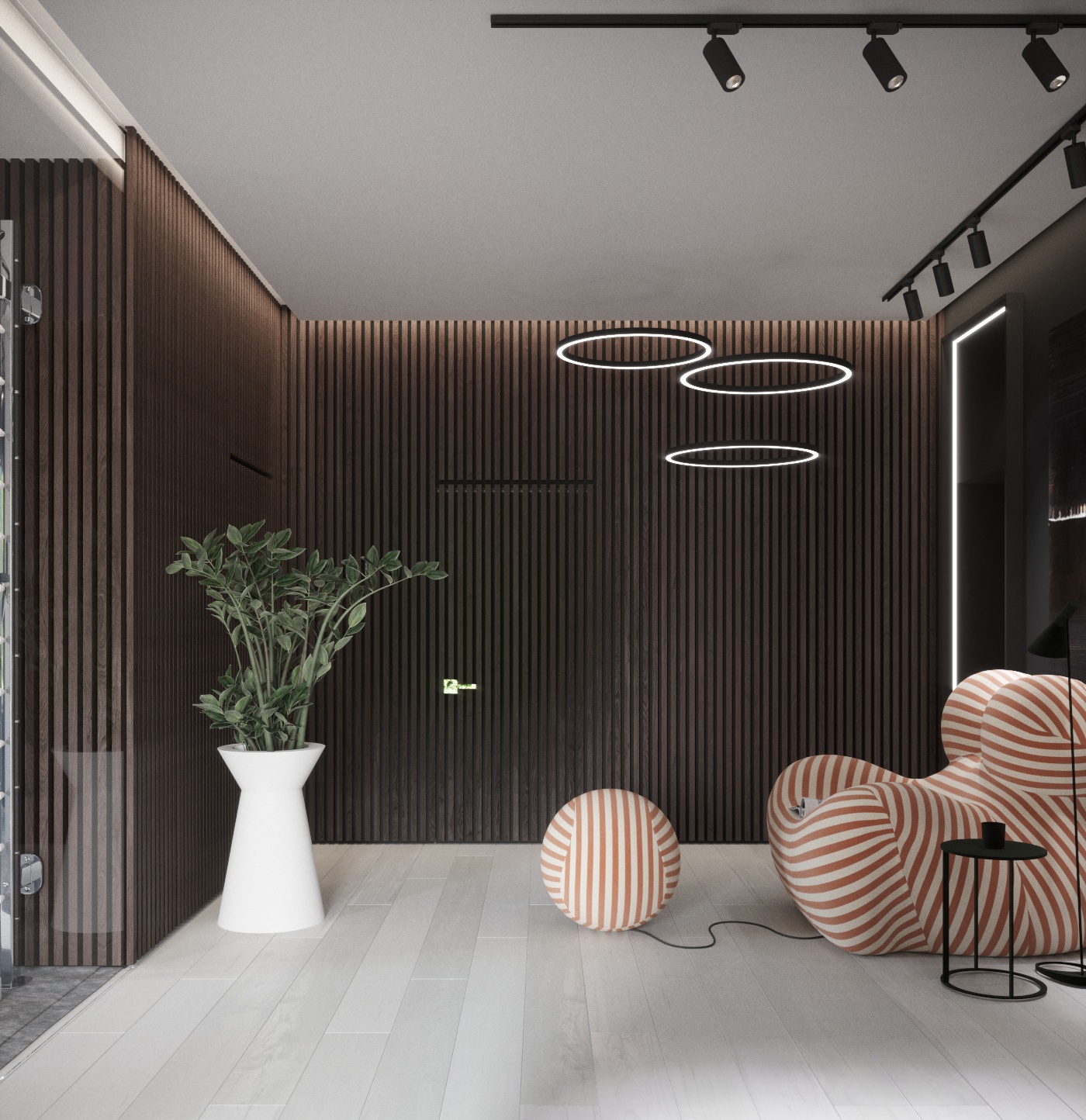 Из большого холла мы попадаем либо на лестницу, либо в гараж, гостевую спальню санузел и широкий проем в гостиную. Много дверей, заметили? Но все они скрыты под отделкой стен, такой прием можно осуществить используя двери скрытого монтажа, их можно покрывать тем же материалом, что и стены, а если дополнительно выфрезировать на них место под керамогранит изи зеркало, то они так же будут незаметны, как в нашем случае, в холе 2го этажа тоже много дверей(4), 2 из них мы прячем под деревянные рейки, а 2 другие визуально увеличиваем по высоте и делаем из них арт-объекты.