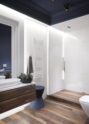 В проекте использовали светлые тона, оттенки бежевого в сочетании с натуральным камнем и белым напольным покрытием, использовали ламинат.