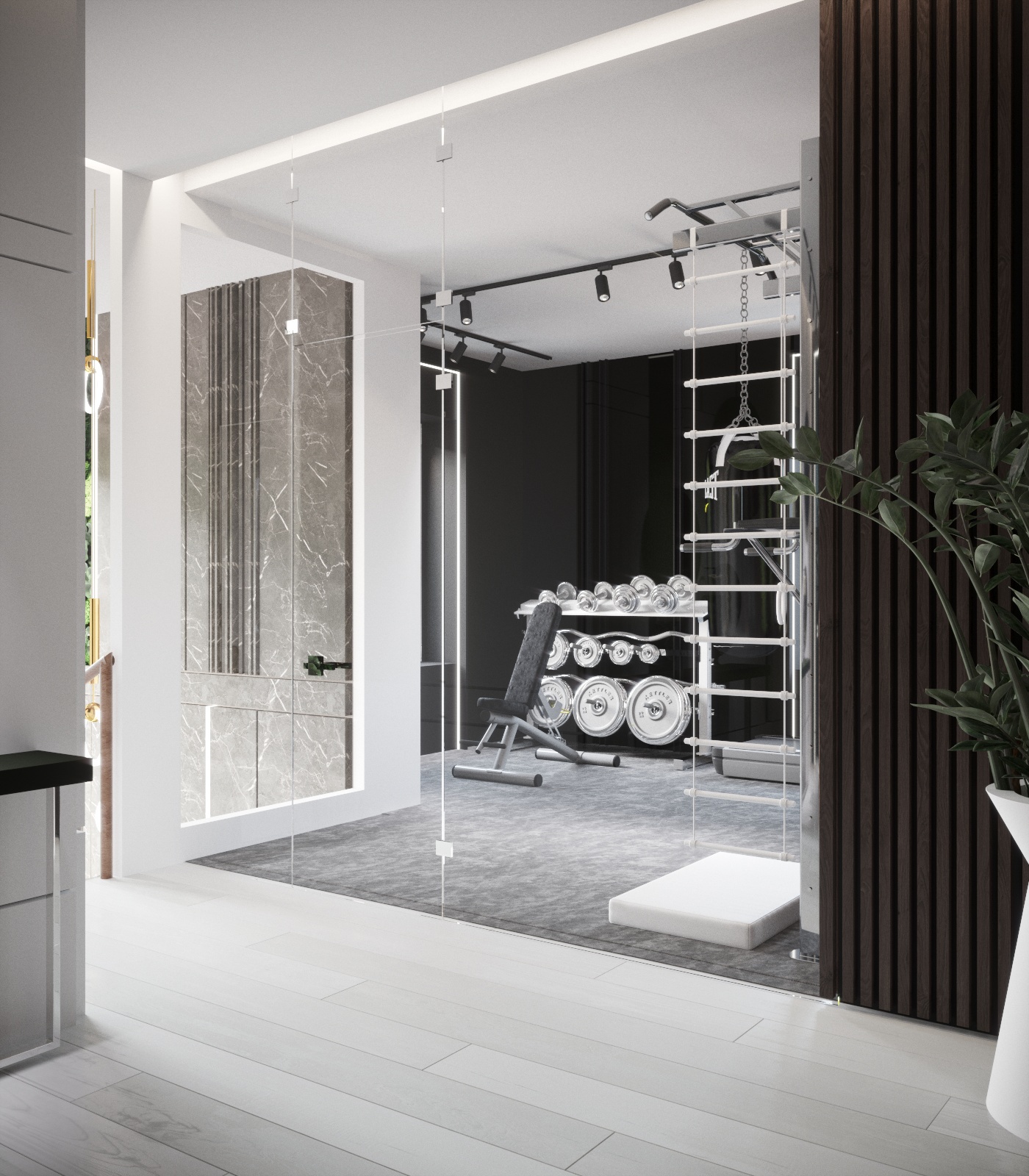 Вернемся на 1 этаж, здель еще есть гостина, совмещенная с кухней в кофейных оттенках в сочетании с синим цветом. На втором этаже мастер-спальня, со соим снузлом и гардеробной, 2 детские комнаты и спортивный зал.