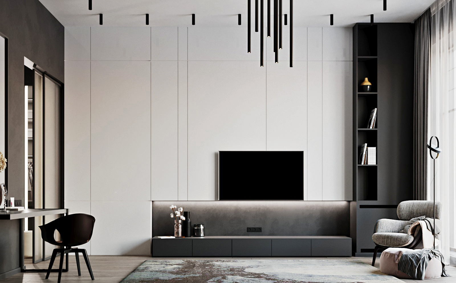 В проекте использовали сочетание черного цвета с деревянным шпоном, сложными оттенками серого цвета зелень, высота помещения 4 метра.