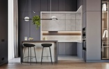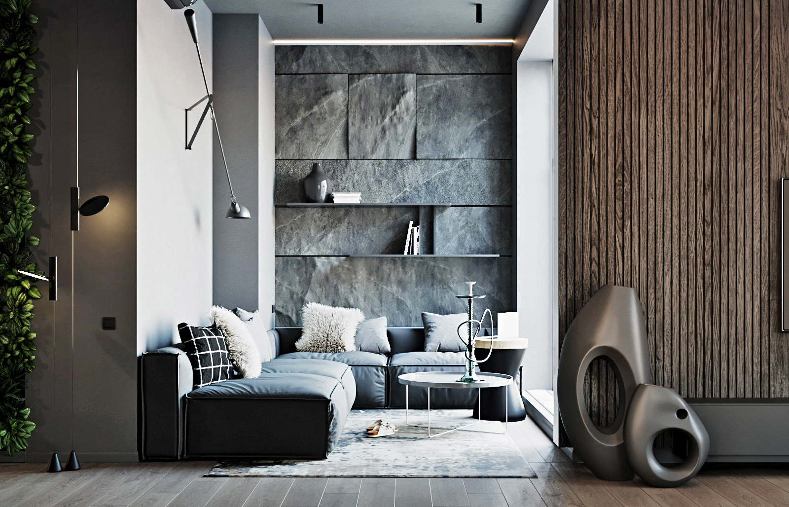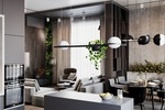 В проекте использовали сочетание черного цвета с деревянным шпоном, сложными оттенками серого цвета зелень, высота помещения 4 метра.