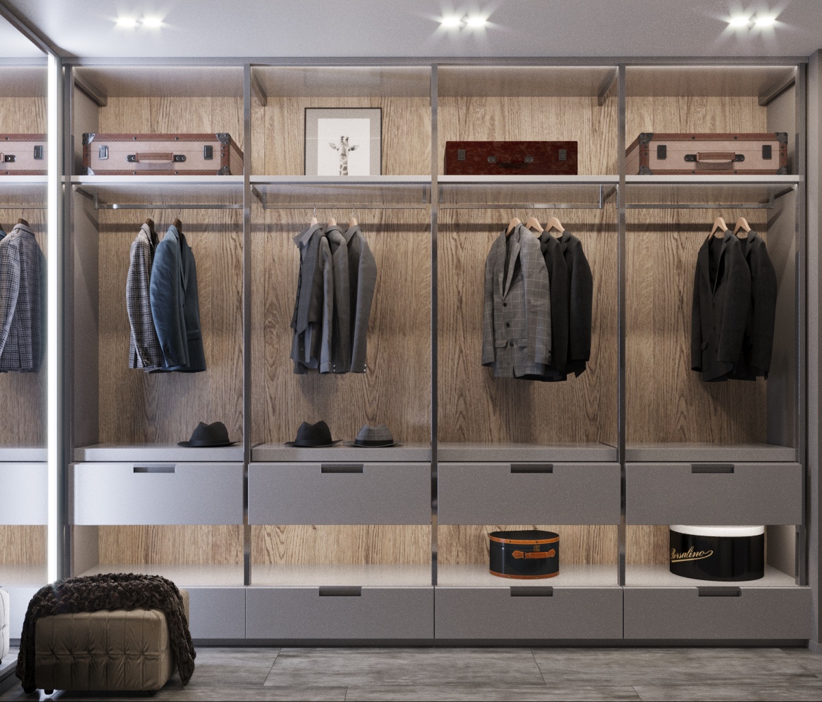 Проект квартиры для мужчины. Задачей было сделать максимально открытое пространство кухни гостиной с изолировнной спальней, с отдельной гардеробной, интерьер в современном стиле, ближе к минимализму.
