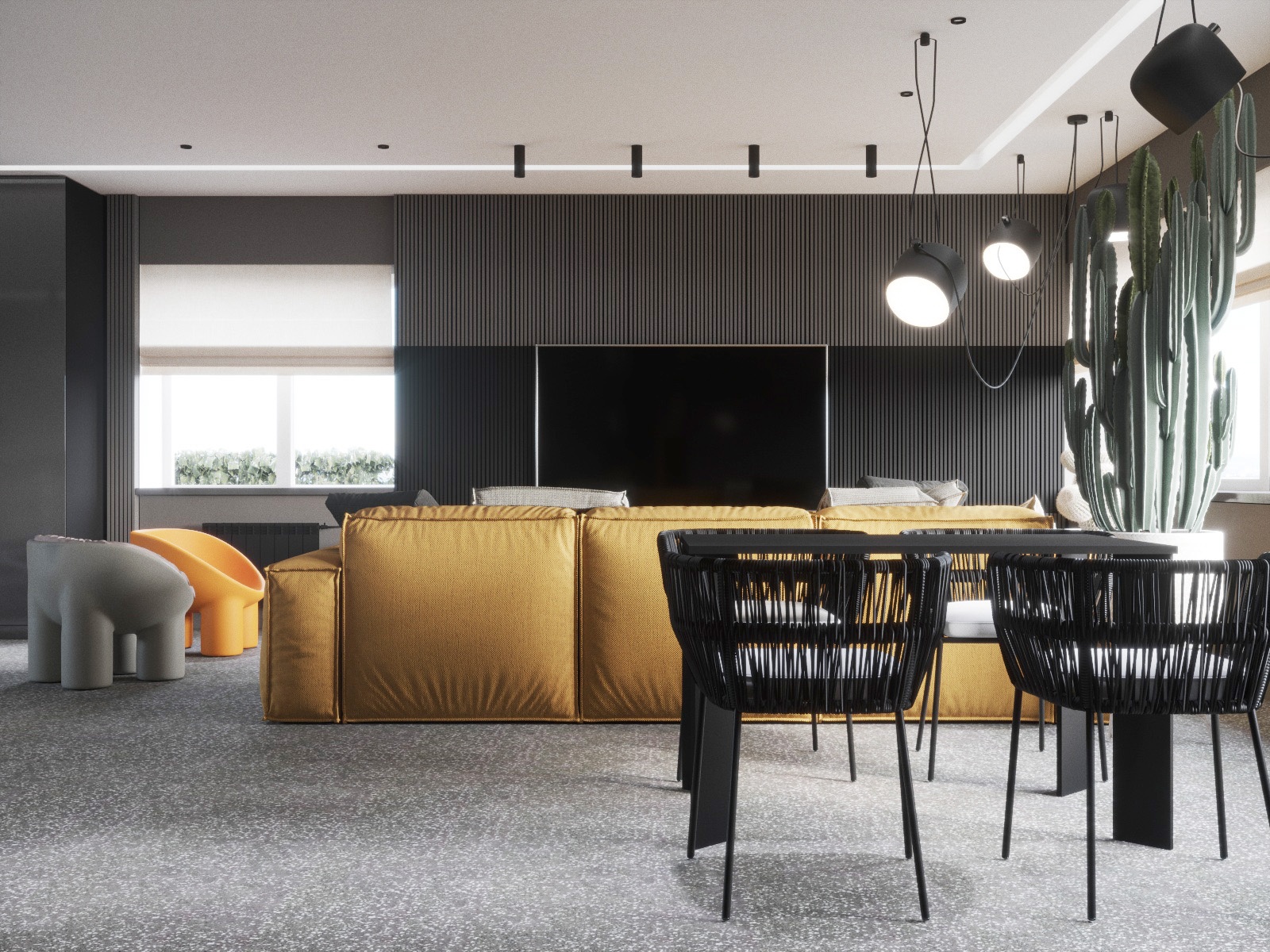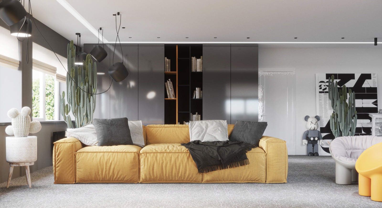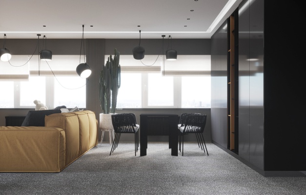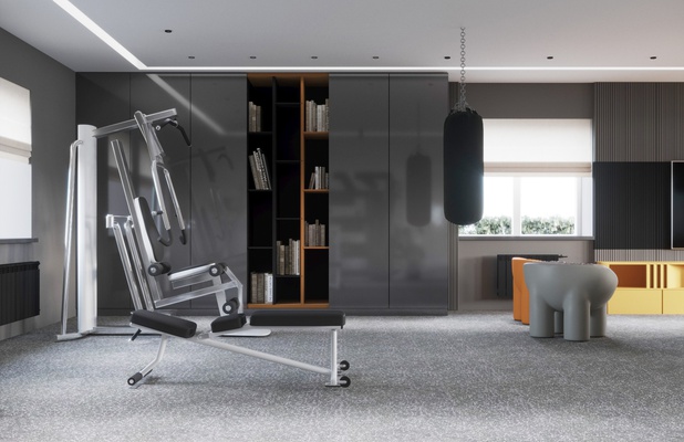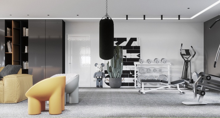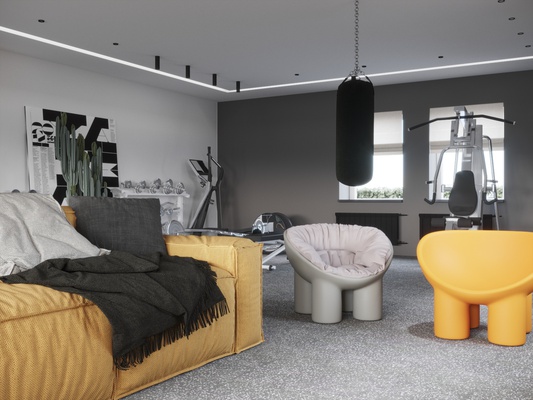 Проект спортзала для сына, это часть большого и старого проекта, реализация которого началась только сейчас, и нам дозаказали спортзал. Хозяин любит желтый цвет, который мы взяли за основной акцент, фоном стал серый и ценый цвета, при том, что основной фон белый. в зоне спортзала есть игровая зона с трансформируемыми диванами-пуфами, шкаф для хранения, груша, спортивный инвентарь и тренажеры, теннисный стол.